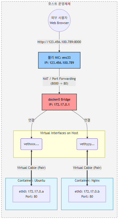 - 물리 NIC & NAT: 호스트가 요청을 받아 docker0 브리지로 트래픽을 넘겨준다. 이 과정에서 포트 포워딩 규칙이 적용된다.