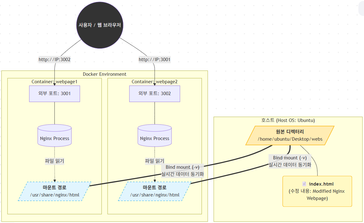 - 데이터 공유: 여러 컨테이너(webpage1, webpage2 등)가 하나의 호스트 경로를 공유함으로써 동일한 콘텐츠를 서비스할 수 있다.