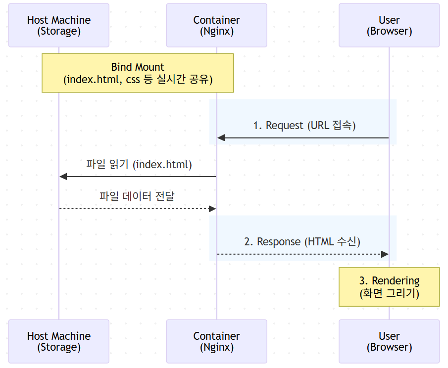 -v $(pwd):/usr/share/nginx/html: 호스트의 현재 경로($(pwd))를 컨테이너 내부의 /usr/share/nginx/html 디렉토리와 마운트(연결) 한다. 즉, 내 컴퓨터의 파일이 수정되면 컨테이너 내부의 웹 파일도 즉시 변경된다.