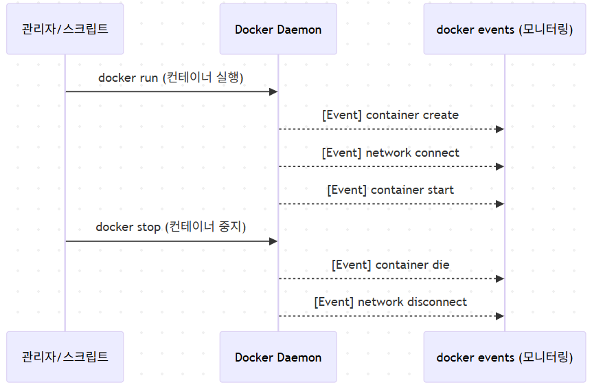 도커 데몬은 컨테이너의 생성, 시작, 정지, 삭제 등 모든 생명주기 변경 사항을 '이벤트(Event)'로 처리한다.