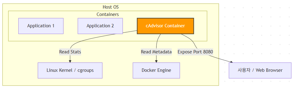 - -v /sys:/sys:ro : 리눅스 커널의 시스템 정보(cgroup 등)를 읽어 CPU, 메모리 통계를 수집한다.