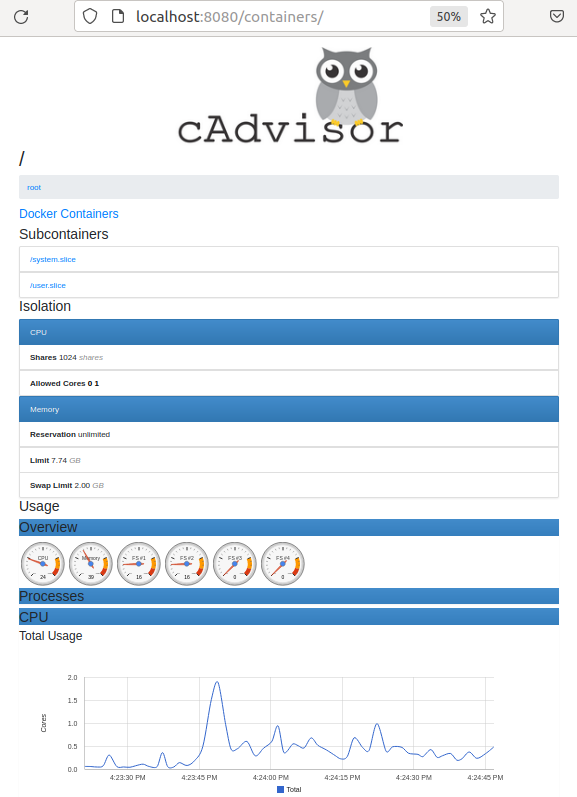 CLI는 직관적이지 않을 때가 있다. 구글에서 만든 cAdvisor(Container Advisor)는 컨테이너 형태로 실행되어 호스트와 다른 컨테이너들의 상태를 웹 UI로 보여주는 도구다.