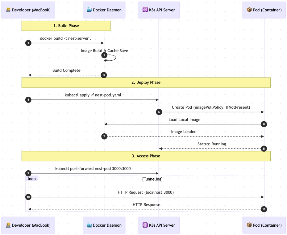 이번에는 NestJS 프레임워크로 간단한 백엔드 서버를 만들고, 이를 도커 이미지로 빌드한 뒤 쿠버네티스 파드(Pod)로 배포하여 접속하는 전체 워크플로우를 정리해보자.