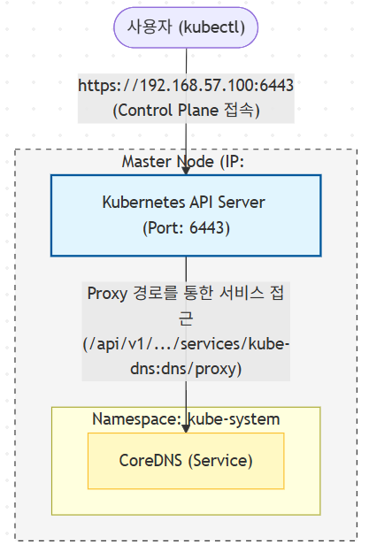 - 서비스 프록시(Proxy) 구조: 뒤에 붙은 긴 경로는 API 서버를 거쳐서 CoreDNS 서비스에 접근할 수 있는 프록시(Proxy) 경로 다. CoreDNS의 주소가 API 서버 주소 뒤에 길게 붙어 있는 이유는, 외부에서 CoreDNS에 직접 접근하는 것이 아니라 API 서버가 중간에서 연결을 대행(Proxy)해주고 있기 때문이다.