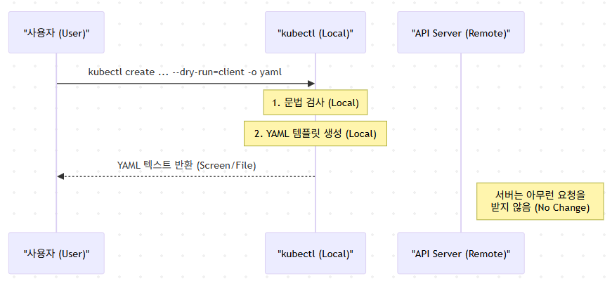 | --dry-run=client | 가상 실행 | 실제로 클러스터(서버)에 명령을 보내지 않고, 내 컴퓨터(클라이언트) 선에서 실행 결과만 미리 계산해봄. |