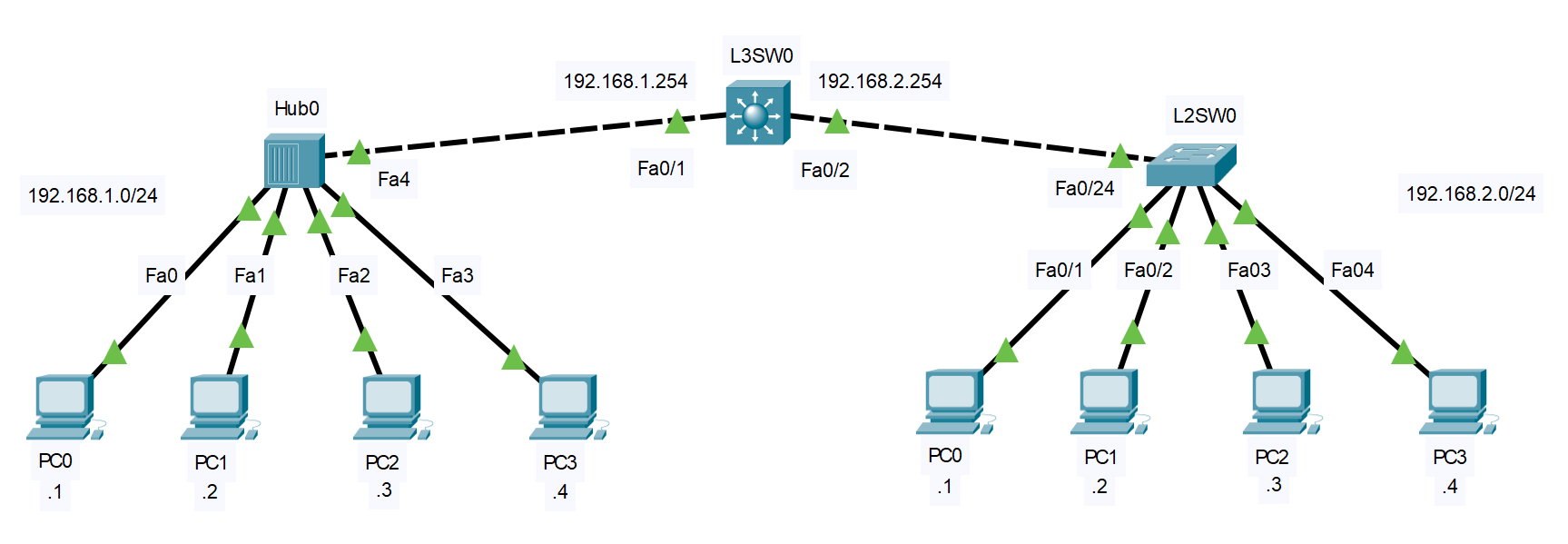 - L3SW0 (중앙): 두 네트워크의 게이트웨이 역할을 수행하며 라우팅을 담당한다.
