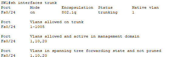 - 위에서 생성한 10번(v10)과 20번(v20) VLAN이 여기에 포함되어 있어야만 SW1과 SW2 사이에 통신이 가능하다.