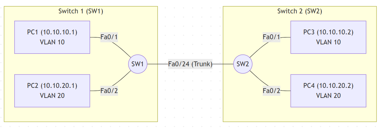 - 데이터의 흐름: PC1이 보낸 프레임은 SW1의 VLAN 1로 들어와서, 같은 VLAN 1 멤버인 Fa0/24를 통해 나간다. SW2의 Fa0/24 역시 VLAN 1 멤버이므로 이 프레임을 받아 같은 VLAN 1 멤버인 PC3(Fa0/1)에게 전달한다.