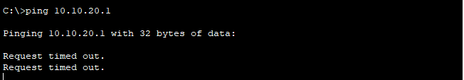 VLAN을 나눈 후, SW1에 연결된 PC1에서 SW2에 연결된 PC3으로 핑(Ping)을 보내면 통신이 실패하는 것을 볼 수 있다.