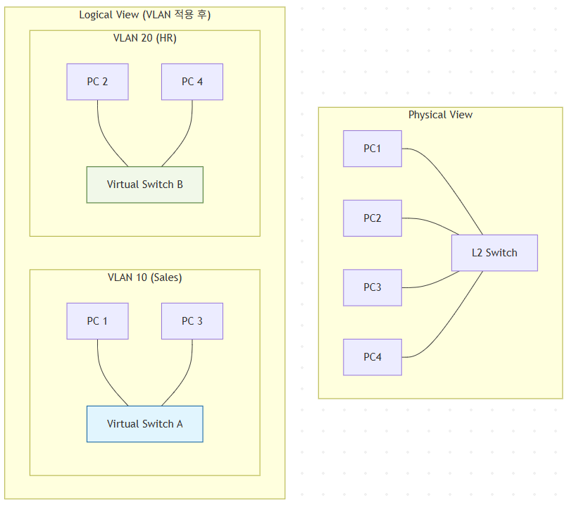 물리적으로는 하나의 스위치에 모든 PC가 연결되어 있지만, VLAN 설정을 통해 마치 별개의 스위치에 연결된 것처럼 분리되는 개념이다.