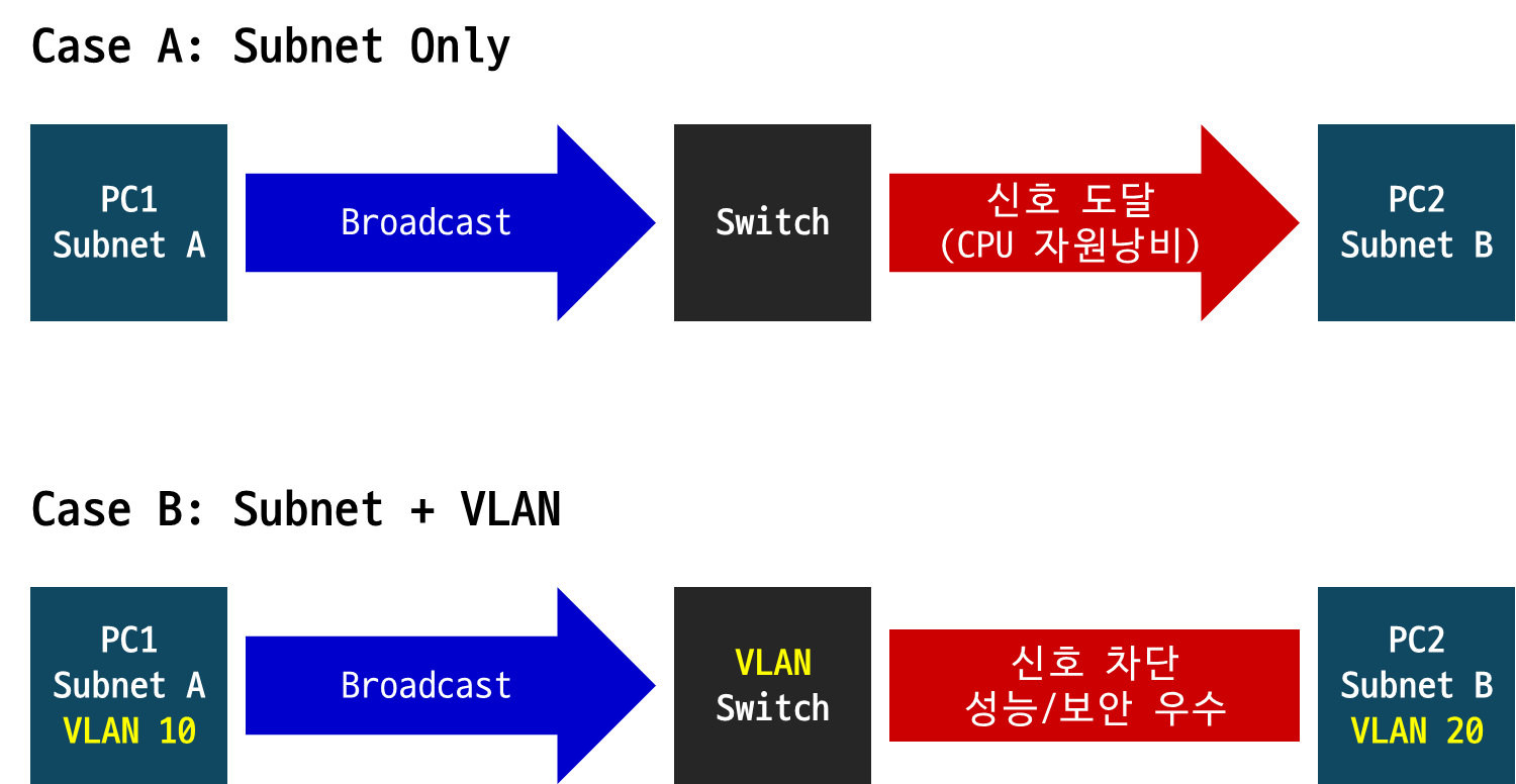 - VLAN이 있다면: 브로드캐스트 패킷이 해당 VLAN 내부로만 한정되므로 전체 네트워크 효율이 좋아진다.