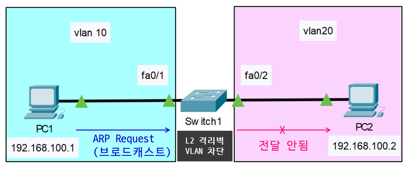 - PC는 서브넷이 같으면 직접 대화하려 하지만, 스위치는 VLAN이 다르면 선을 끊어버린다.