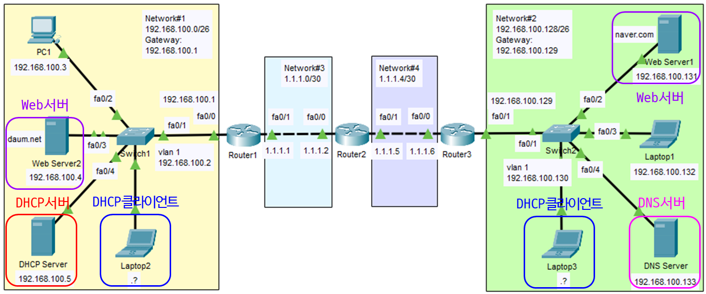 Laptop3: 192.168.100.? (DHCP 클라이언트이기 때문에 static IP 설정을 하지 않은 상태)