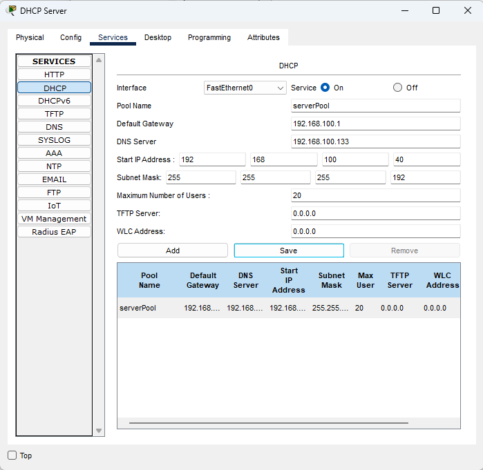 이제 클라이언트(Laptop2, Laptop3 등)가 위에서 만든 서비스들을 자동으로 이용할 수 있도록 Network#1의 DHCP 서버를 설정한다.