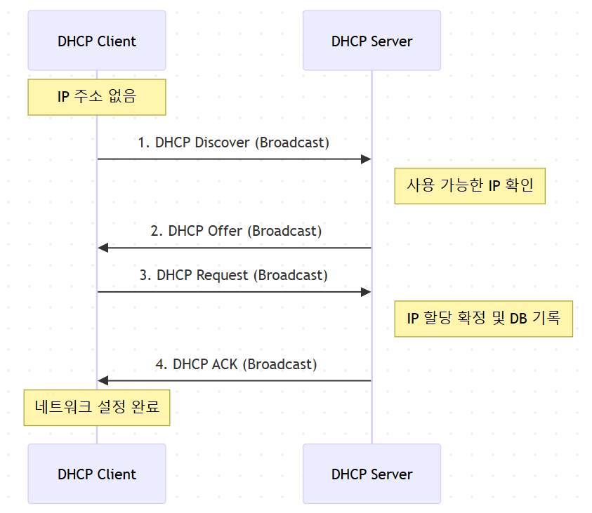 DHCP 클라이언트가 서버로부터 IP를 할당받는 과정은 네 단계의 패킷 교환으로 이루어지며, 각 단계의 앞 글자를 따서 DORA라고 부른다.