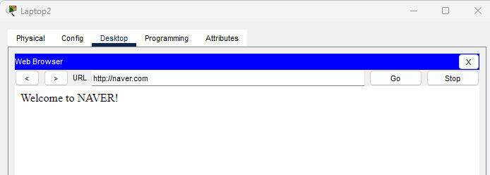 Laptop2의 IP 설정을 DHCP로 바꾼 뒤, 웹 브라우저 주소창에 naver.com을 입력했을 때 페이지가 뜨면 성공이다.