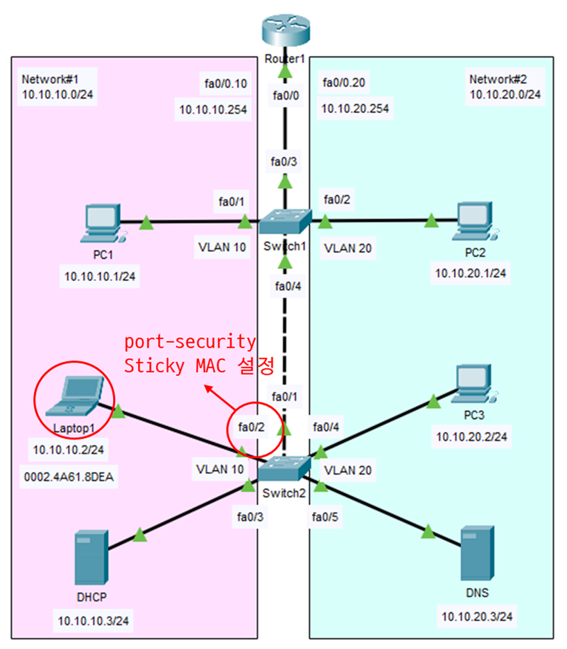 포트 시큐리티는 사용자가 직접 접속하는 Network 1의 액세스 스위치(SW2)를 대상으로 설정한다.