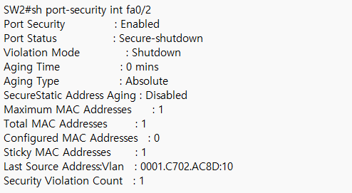 SW2(config-if)# sw port-security violation shutdown !위반 시 포트를 즉시 차단