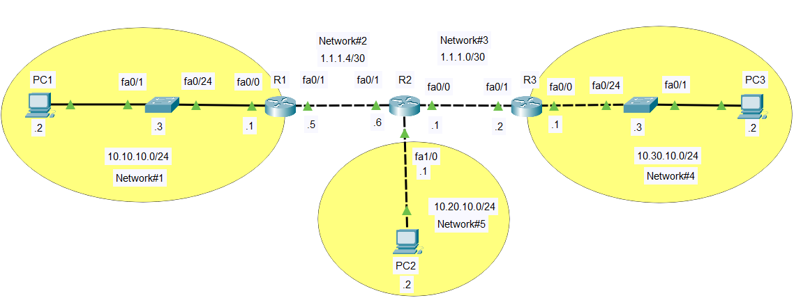 위에 제시된 토폴로지에서 PC가 연결된 LAN 구간(Network #1, #4, #5)에는 라우팅 정보를 보낼 필요가 없다.