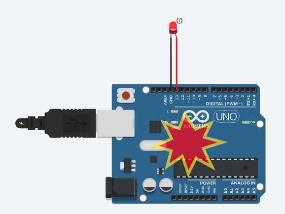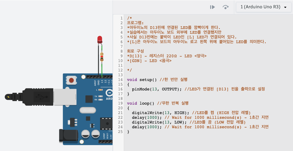 LED의 양극 다리는 D13핀에 연결하고 음극 다리는 GND(접지) 핀에 연결한다.