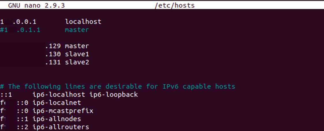 모든 노드(Master, Slaves)가 서로의 이름과 IP를 알 수 있도록 모든 노드에서 /etc/hosts 파일을 열어 클러스터의 모든 노드들의 IP주소와 이름을 입력한다. 이 파일은 모든 노드가 동일한 내용을 공유해야 한다. (2번 행은 1번행과 중복이므로 주석처리 하거나 삭제. 컴퓨터가 위에서부터 읽기 때문에 주석처리를 안하고 놔두면 ssh master를 쳤을 때 진짜 IP ***.***.***.129를 무시하고 자기 자신(localhost)으로 접속해버림.)