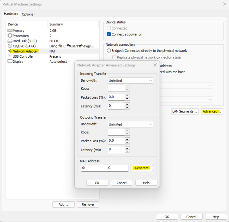- VMware에서 해당 슬레이브 노드 (power off한 상태에서) 가상머신의 설정을 열고 Network Adapter -> Advanced 메뉴로 들어간다.